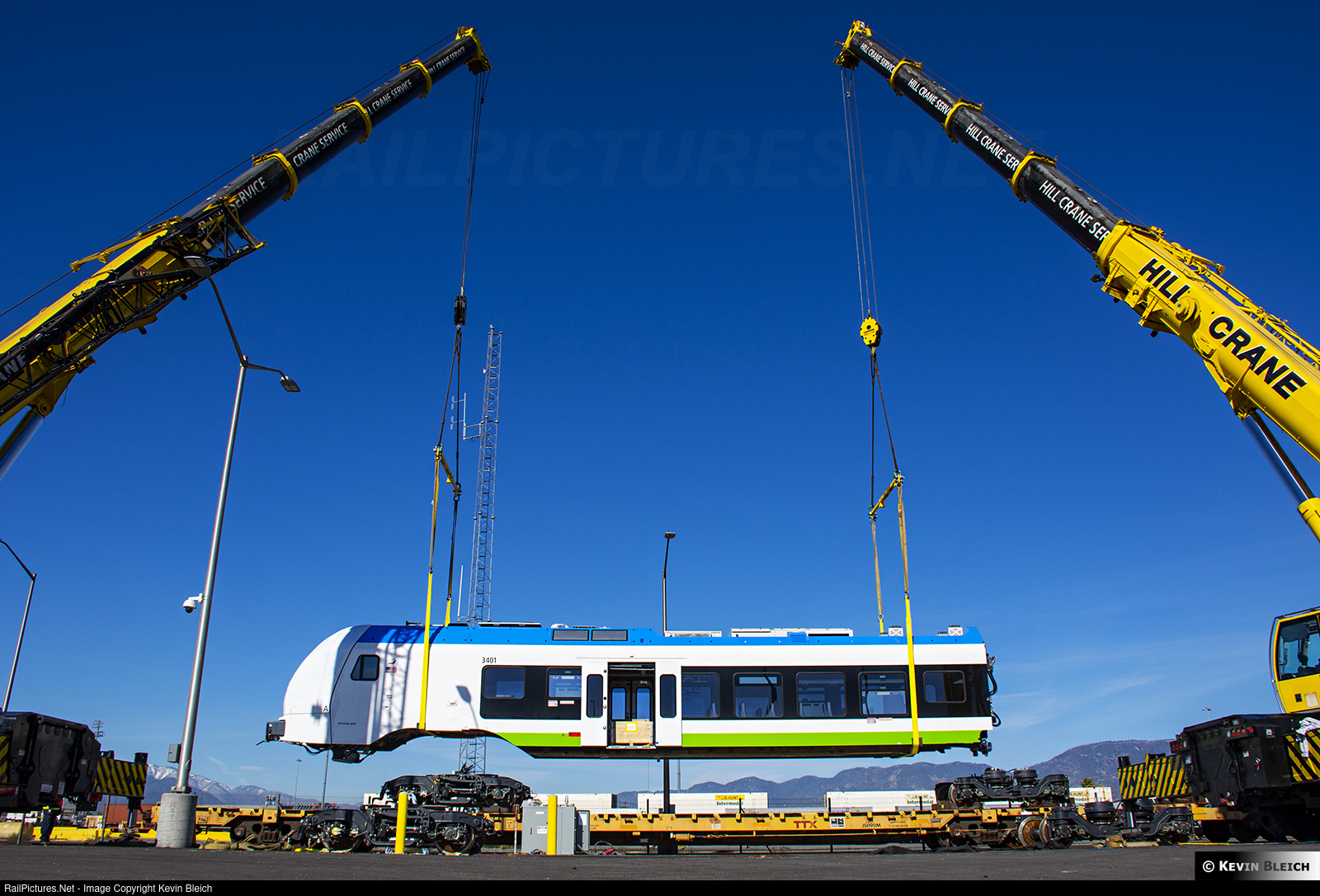 The first Stadler DMU for the new Arrow service between San Bernardino and Redlands, CA briefly swings in the air as it is lifted off the flatcar it was delivered on and placed on its own wheels. After working on this project for the past several years, this was a long-awaited milestone.