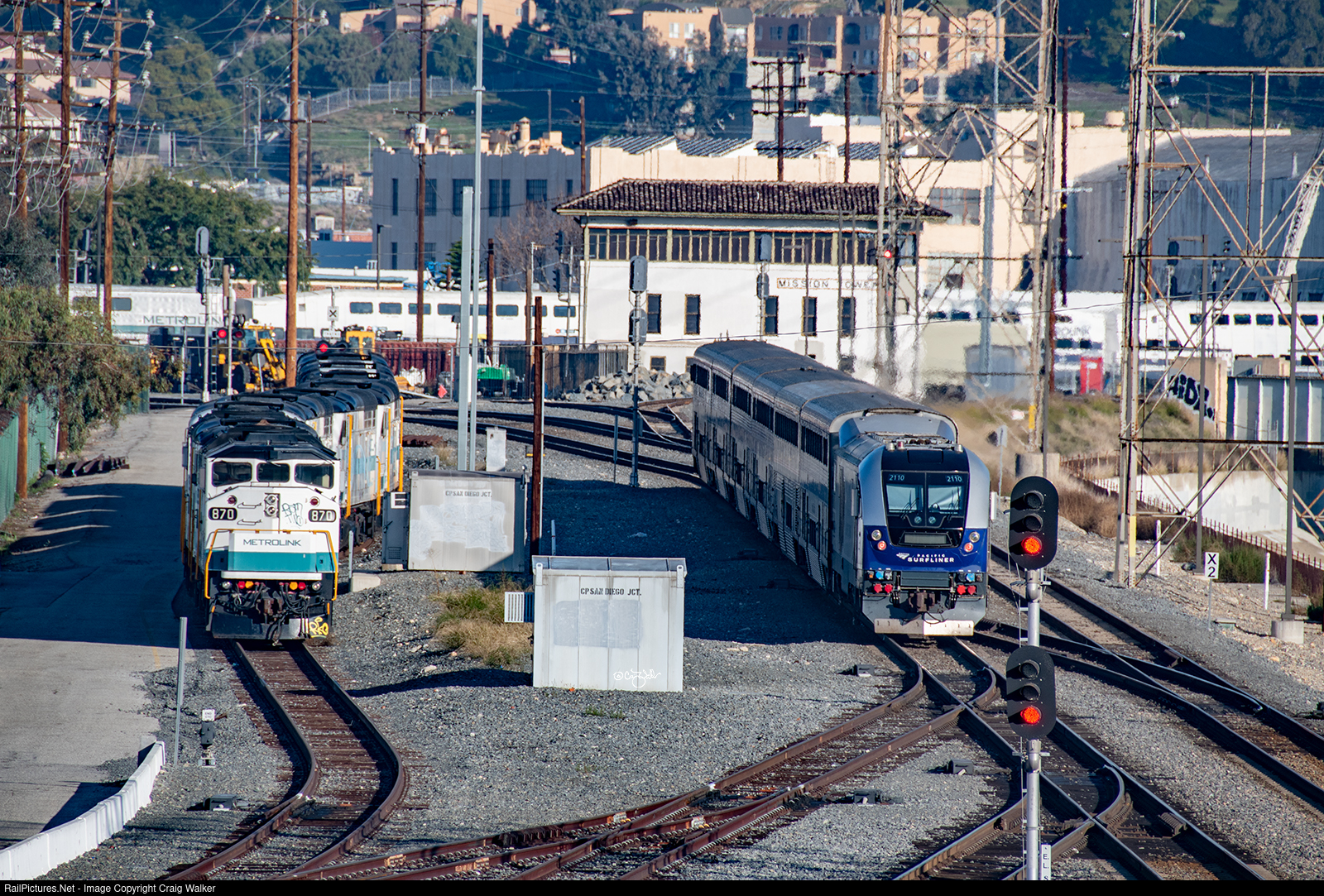 Amtrak Pacific Surfliner 765 (San Diego to Goleta), with CDTX SC-44 "Charger" 2110 pushing the six-car train, is about to make the left turn at Mission Tower and head into stub-end Los Angeles Union Station. Just before the curve, it passes a deadline of at least nine stored Metrolink F59PH and F59PHI diesels. Just beyond Mission Tower is a Metrolink San Bernardino Line train heading east to (where else?) downtown San Bernardino, crossing the Los Angeles River as it passes the tower. This area has a real maze of trackage, as Santa Fe, Southern Pacific and Union Pacific all converged here, from the north, south and east, to enter Union Station. Mission Tower and, in Union Station, Terminal Tower used to control all these train movements, but today Metrolink handles this congestion from a dispatching center in Pomona, some thirty miles to the east. (Los Angeles, California – January 5, 2022)