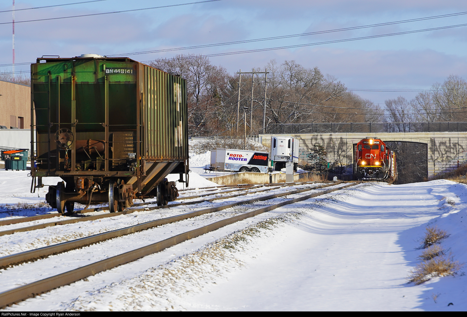 The crew is done dropping cars at New Brighton and reconnects to the cars headed for Northtown Yard. This BN hopper was in the middle of the eastbound consist and now left here on the siding. Its left in the way of their pickup on the return trip so I guess they will bring it west or CP could take it.