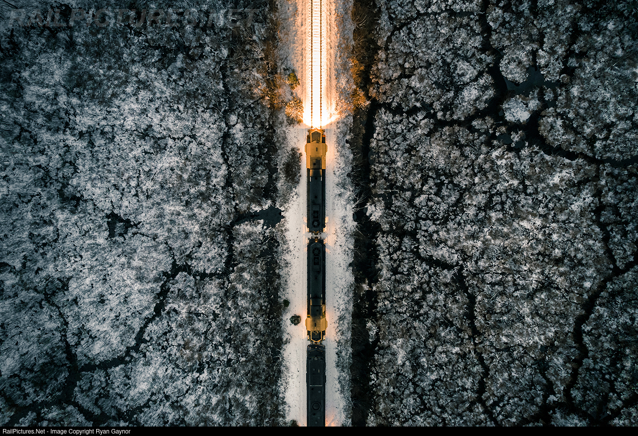 | Peering down on the frozen landscape below, ONR's Toronto to North Bay test train no. 301 patiently waits for a CN track gang to clear before making their next stop at Gravenhurst, ON. |