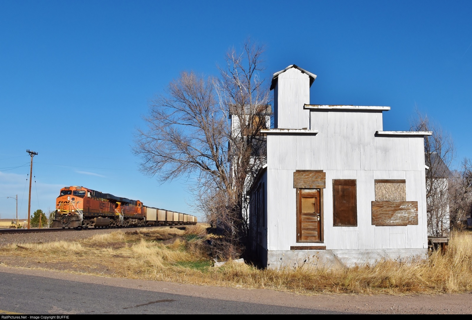 BNSF 5905 (ES44AC) passes an old silo building in Merino, Colorado.