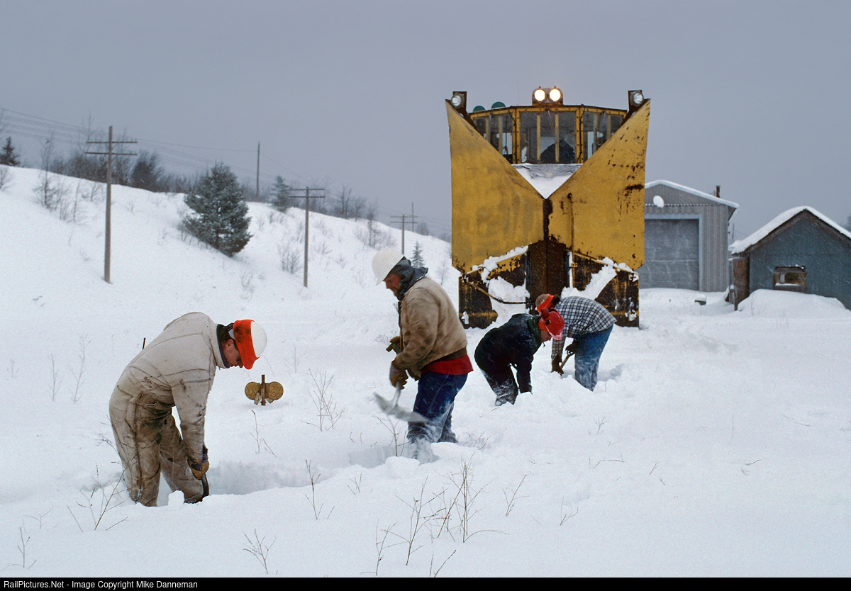 Men on the ground help out with snow removal around a switch as Wisconsin Central Jordan spreader No. 315 waits behind them in the yard at Ishpeming, Michigan, on December 29, 1996. Finding and digging out all the switches in the deep snow wasn’t the easiest task that wintery day!