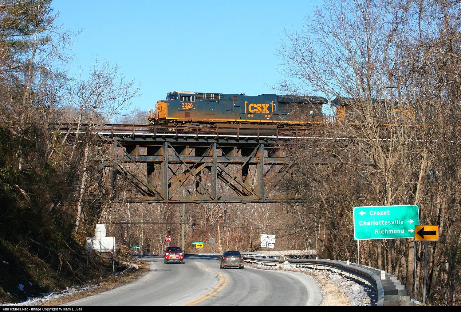 CSX 3326 West crossing the Mechums River truss bridge at the intersection of route 240 and US 250
