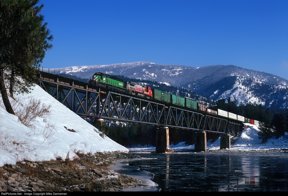 An eastbound Burlington Northern Santa Fe freight rumbles over Bridge 208 spanning an icy Clark Fork at Donlan, Montana, on a cold February 9, 1997. Powering the train is BN EMD SD40-2 No. 8102 and Santa Fe GE B40-8W No. 525.