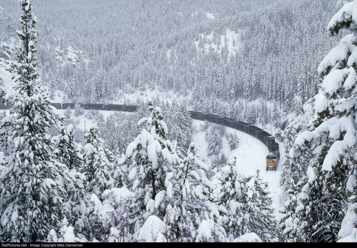 Heavy snow is covering Colorado’s front range mountains on April 23, 1999, as a westbound Union Pacific coal train curves past the former site of Tunnel 28 just east of Cliff siding at Pinecliife on UP’s Moffat Tunnel Subdivision.