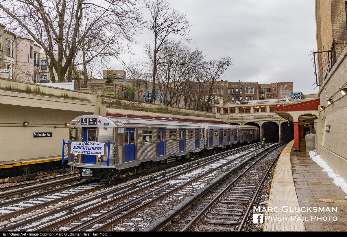Parkside. In a signature BMT scene, R-32 3360 leads the "Farewell To The R-32s” train out of the tunnel under Ocean Avenue in Brooklyn, New York and through the Parkside Avenue Station on Sunday, January 9, 2022. With its repainted blue doors and shiny stainless steel exterior, it is easy to see why this location has been a focus of photographers’ lenses for over a century.