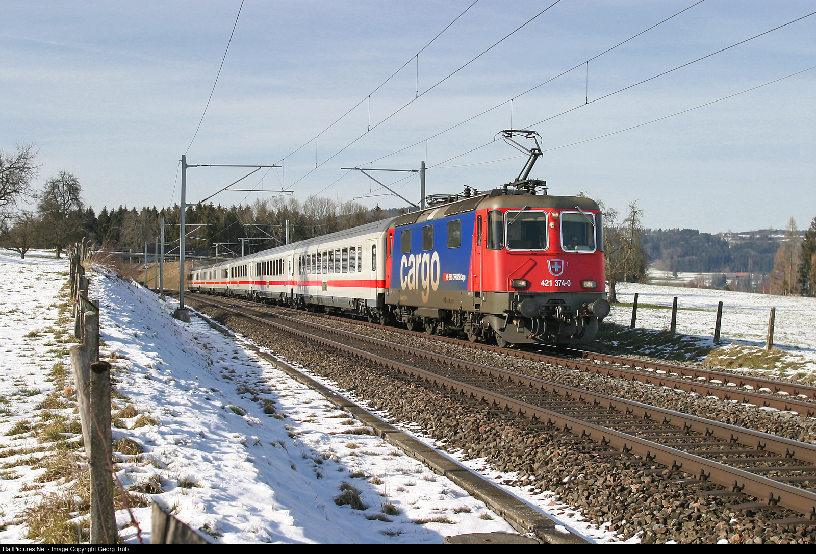 | Re 421 # 374 of the SBB is pulling the Eurocity 195 from Zürich via Winterthur-St.Gallen-St.Margrethen-Bregenz-Lindau to Munich, between Schwarzenbach and Algetshausen-Henau. The cars (3 second class, dining car, 2 fist class) are of the Deutsche Bahn and the Re 421 is in charge till Lindau. From there will be diesel traction to Munich. |