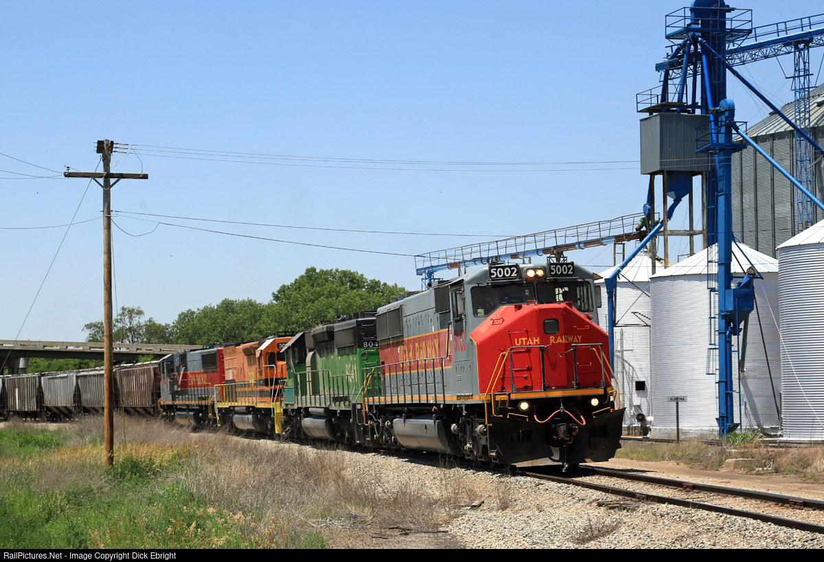 What’s this? A Utah Railway train in Kansas? When the Utah Railway stopped operating its line from Provo, over Soldier Summit to the Helper, Utah area their MK5000 locomotives became surplus. So, Utah’s owner, Genesee & Wyoming, transferred some of them to the Kyle Ry. in Kansas and eastern Colorado. Seen here is a colorful Kyle train with 2 of these MK5000’s eastbound thru the small town of Almena, KS., population 469.