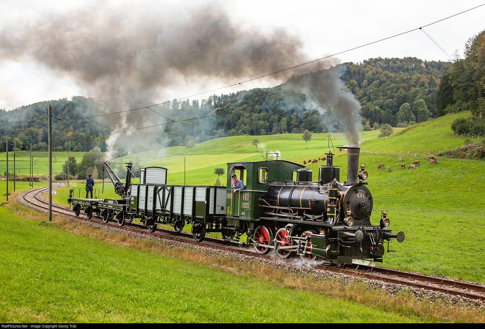 0-6-0 T Ed 3/3 # 401 "Bauma" of the DVZO is pulling a short freight train between Neuthal and Bäretswil on the line Bauma - Hinwil. The locomotive was built in 1901 by the SLM for the Uerikon-Bauma Bahn, but was in operation on the Nordostbahn in the first years.
