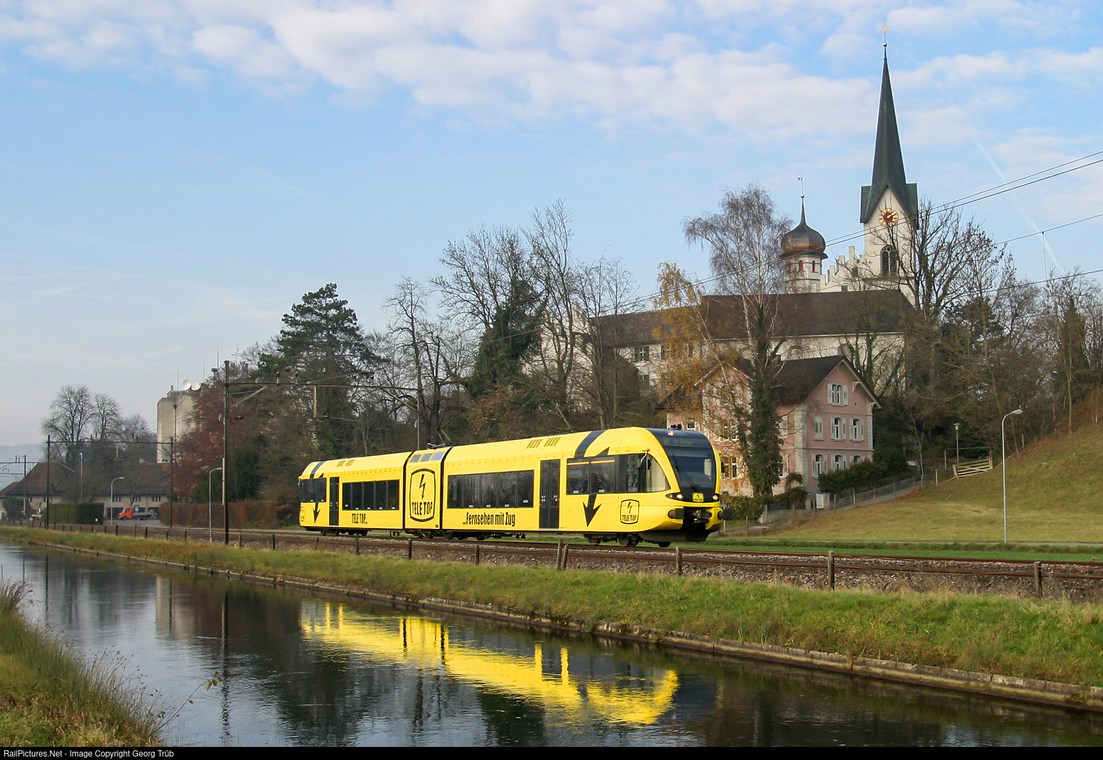 Articulated lowfloor regional train "GTW" RABe 526 # 707 of the Thurbo in the publicity paint scheme for Tele Top running along the work canal in Bürglen.