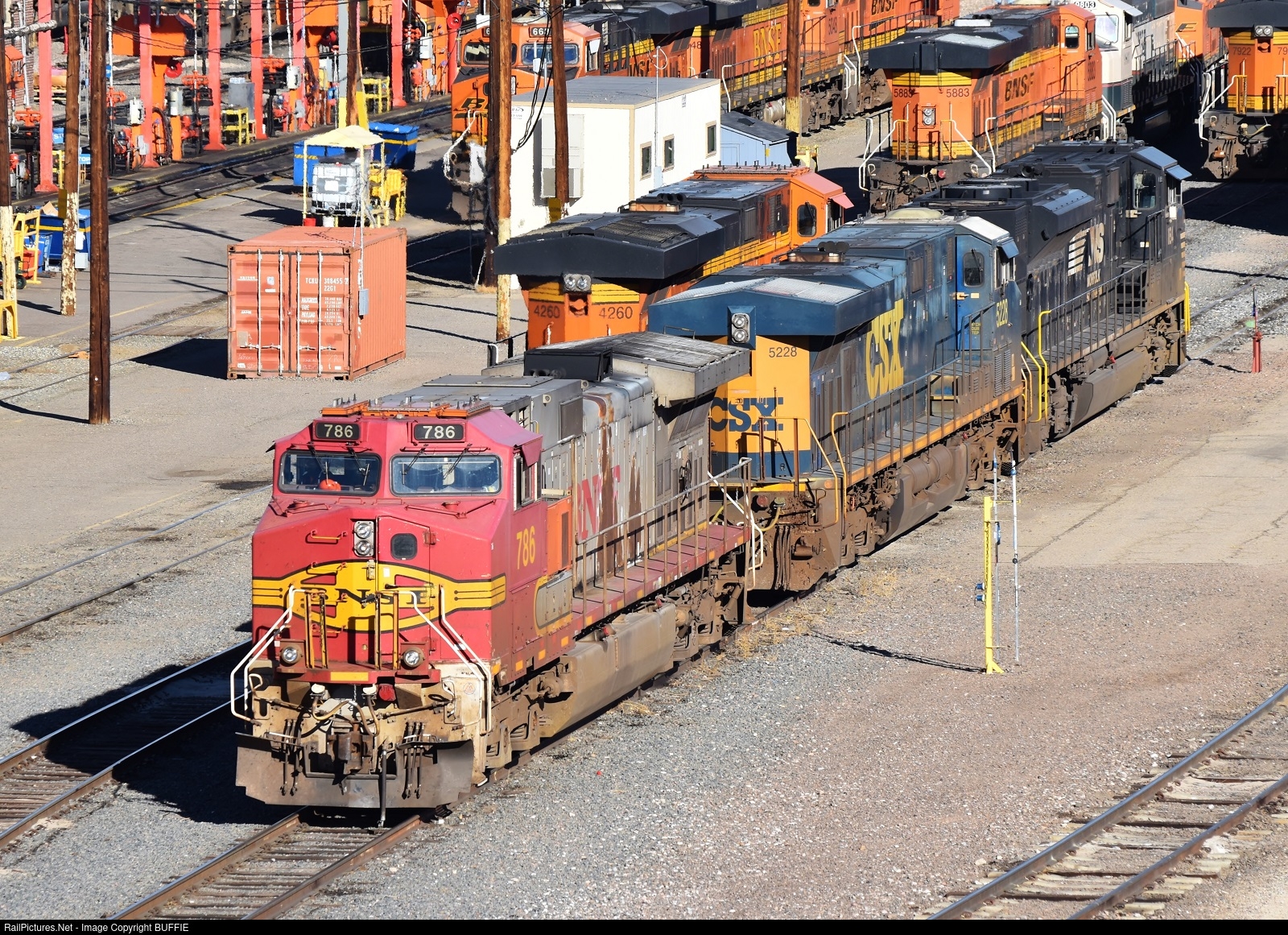 BNSF Warbonnet 765 (Dash9) joins a colorful lashup which includes a CSX and a Norfolk Southern engine.