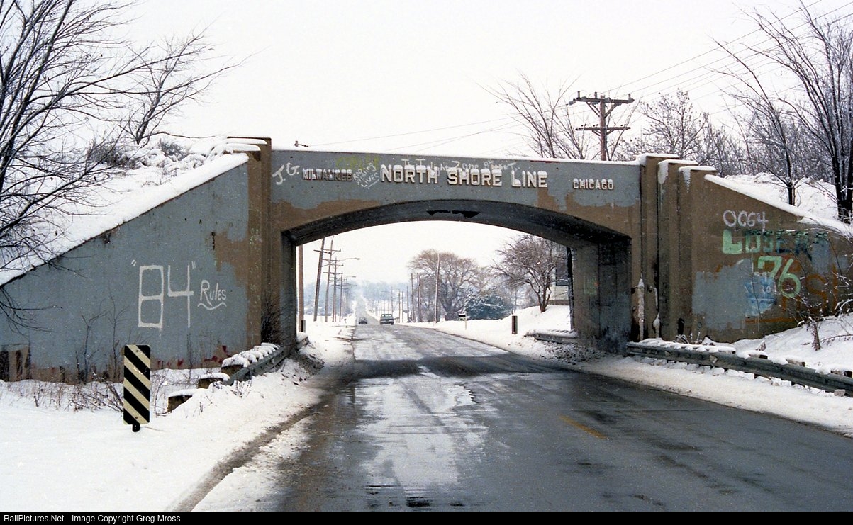 Route of the Electroliners! The North Shore (CNS&M) interurban had some neat Art Deco bridges on their line between Chicago and Milwaukee. 19 years after abandonment, the Drexel Avenue overpass in Oak Creek stands silent, awaiting a train that will never come. This part of the line is now a bike trail, but the bridge was removed several years after I took this shot as part of a road widening project.