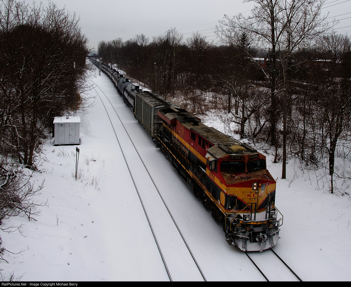 KCS power up north. A bit of snow is falling as KCSM 4755 brings up the rear of loaded ethanol train CP 650, which has just changed crews and is now heading south towards the U.S. If the CP-KCS merger is approved this might become a much more common sight in the future.