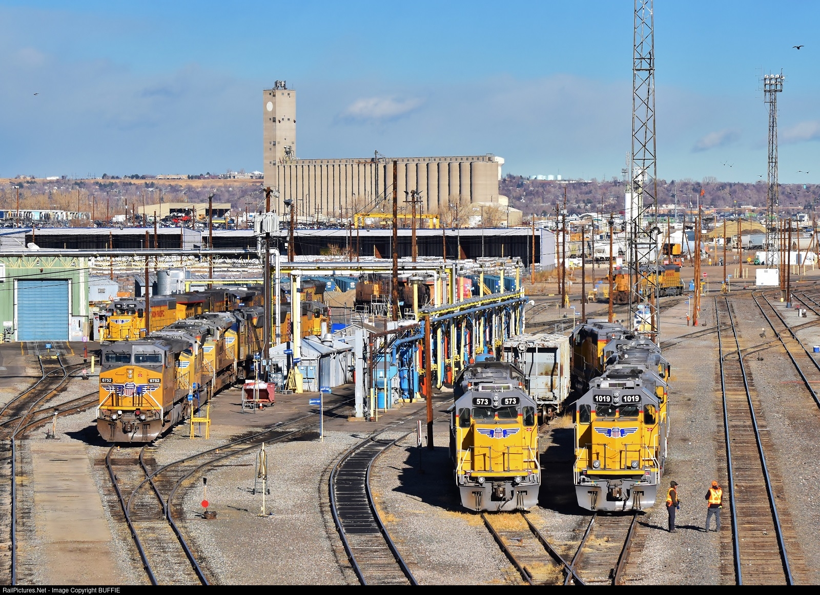 The crew of UP 1019 (GP60) gets ready to take their turn shuffling cars in the Union Pacific's North Yard in Devner, Colorado.