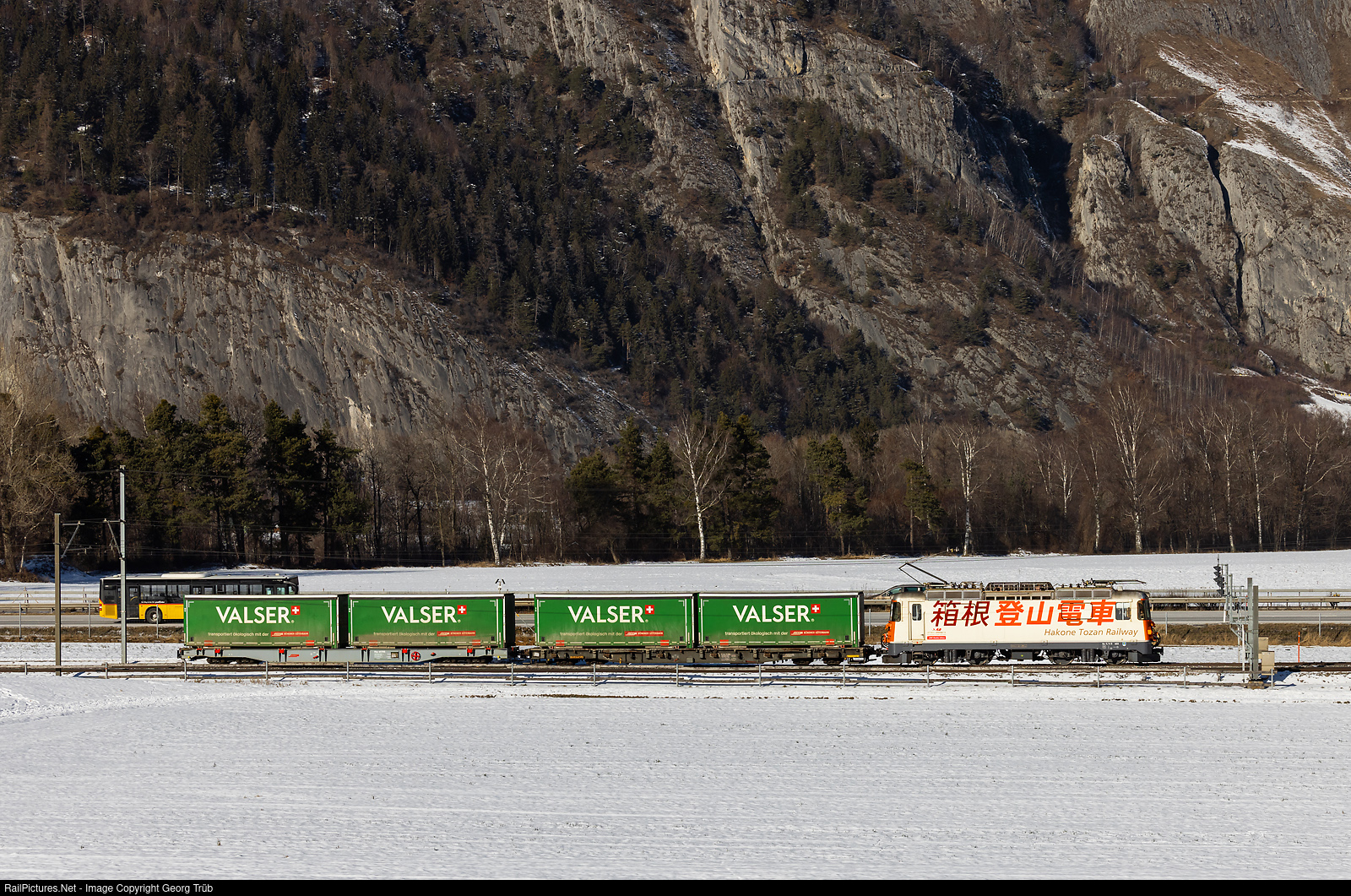 Ge 4/4 II # 622 "Arosa", with a publicity paint scheme for the japanese sister railway Hakone Tozan Railway since 2010, is pulling the short freight train 5742 from Ilanz to Landquart, between Felsberg and Chur. The train, which was running more then 1 hour before schedule, is transporting "Valser" mineral water in swap bodies, loaded on container cars, from Ilanz to the warehouse in Untervaz. Second car is a new Rlp # 65705 rebuilt in 2021 from a Sb-t lowloader container car from 2010.