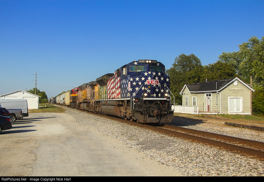 | A497 hustles south down the Mainline of Mid America, passing the old depot in Peotone, Illinois. It features one heck of a leader if the form of Kansas City Southern's sharp veterans' unit. |