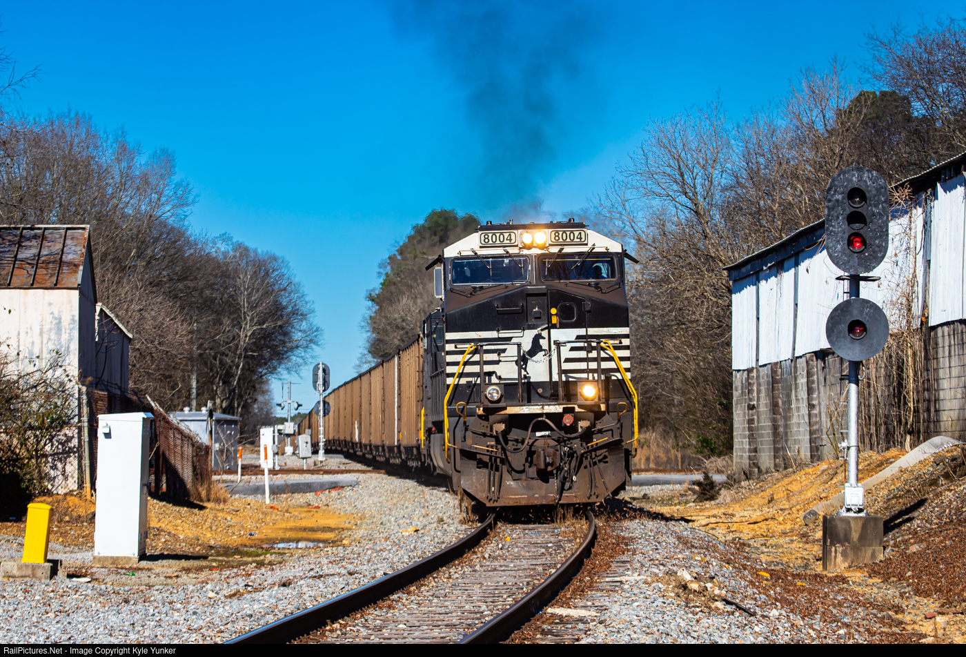 Norfolk Southern loaded coal train #708 departs Cedartown with a fresh crew for its run south bound for Georgia Powers Plant Wansley. The SAL era signals still protect this interlocking where the CofG's Chattanooga,TN - Macon,GA line crossed the SAL Birmingham,AL - Atlanta,GA line. This section of the SAL only sees CSX local A700 a few times a week and the CofG only sees a local and occasional coal trains.