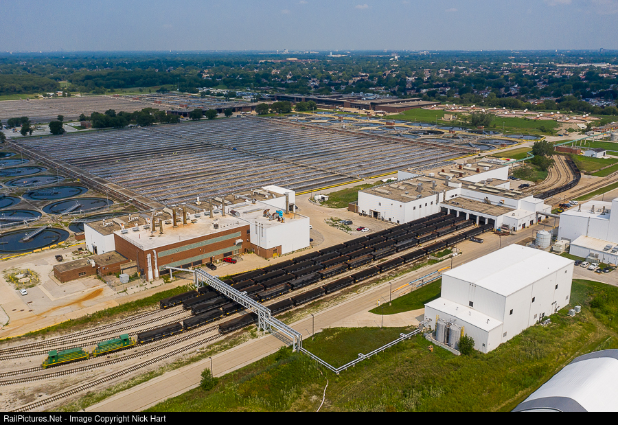 | On a hot and sticky morning, the Metropolitan Water Reclamation District of Greater Chicago's massive, water treatment plant is seen from above in Stickney. Times are busy as multiple trains of loaded waste are set to be taken to the drying fields for unloading. SW1's #'s 3 and 2 are in the process of shoving 26 empties into track 3 of the loader. |