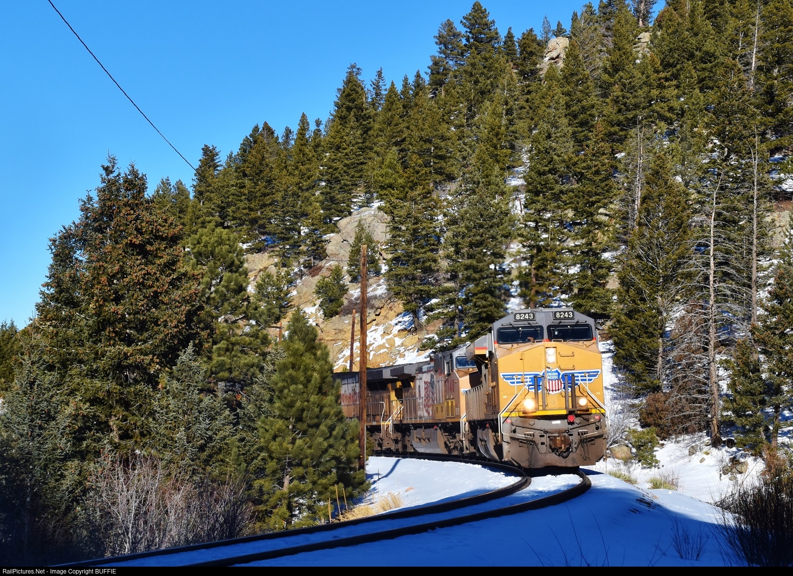 UP 8243 (ES44AC) rounds the corner leading to Tunnel 19 just west of Crescent, Colorado.