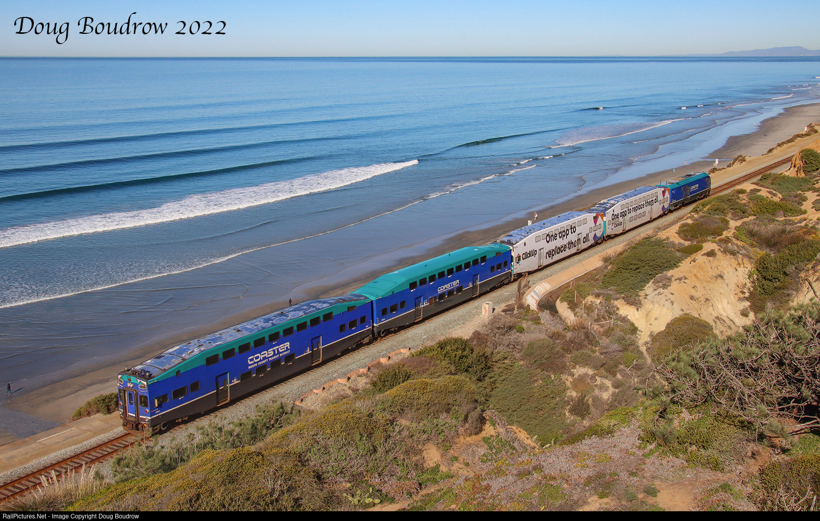 Northbound Coaster Commuter train 629 is seen at Del Mar.