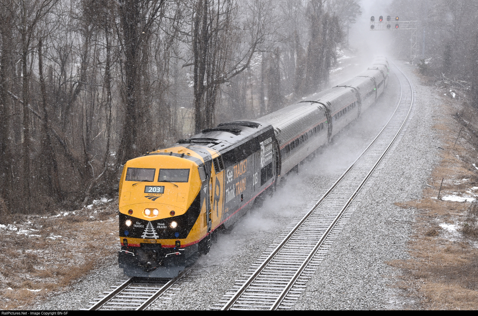 I finally managed to catch this engine after several failed tries the past week. Amtrak #203 was approaching Charlottesville on a rare early Regional #156. In the Unit's first week of operation, it never left the state of Virginia. Luckily, I caught it right as the snow started to fall.