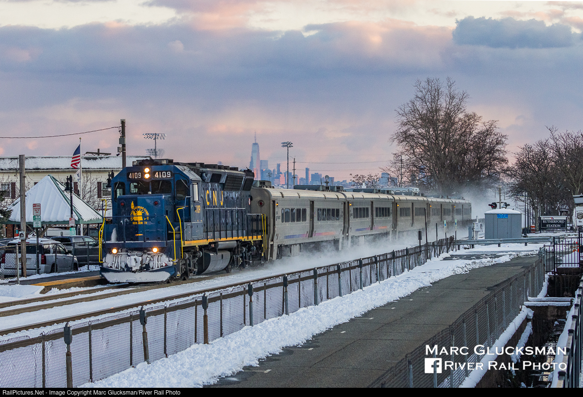 Ripping Through Rutherford. NJ Transit Train 51 is really moving on Friday, January 7, 2022 as it passes through the Rutherford Station on the way to to MTA Metro-North Railroad's Port Jervis Station with GP40PH-2 4109 (CNJ Heritage) leading without stopping. In the background, the Freedom Tower rises from the skyline of New York, New York. The first significant snowfall of the year in the area occurred earlier in the day, and subfreezing temperatures have kept it in place except where the parking lot was plowed for commuters.