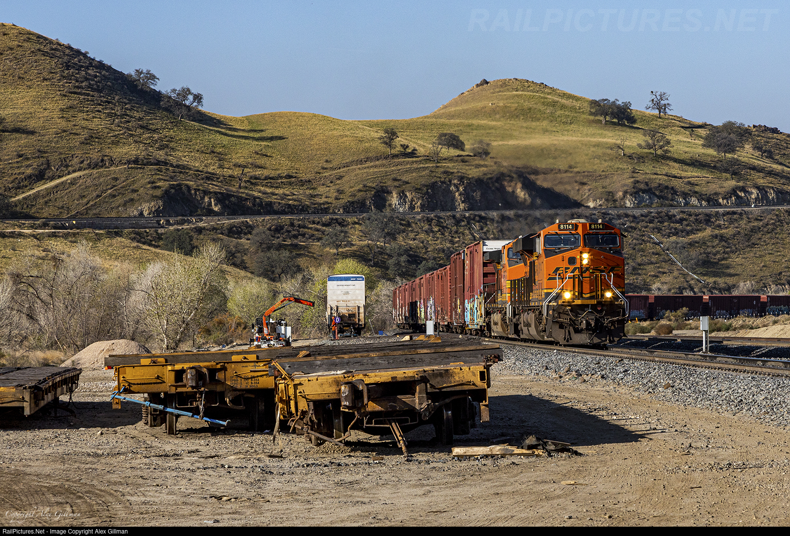 | Rolling to a stop at Caliente, BNSF 8114's assault on the northern slope of Tehachapi Pass has briefly been halted as it will pause to wait for heavy, northbound BNSF grain train to drop down. In the foreground, a number of flat cars that didn't make it to their final destination wait to be moved. |