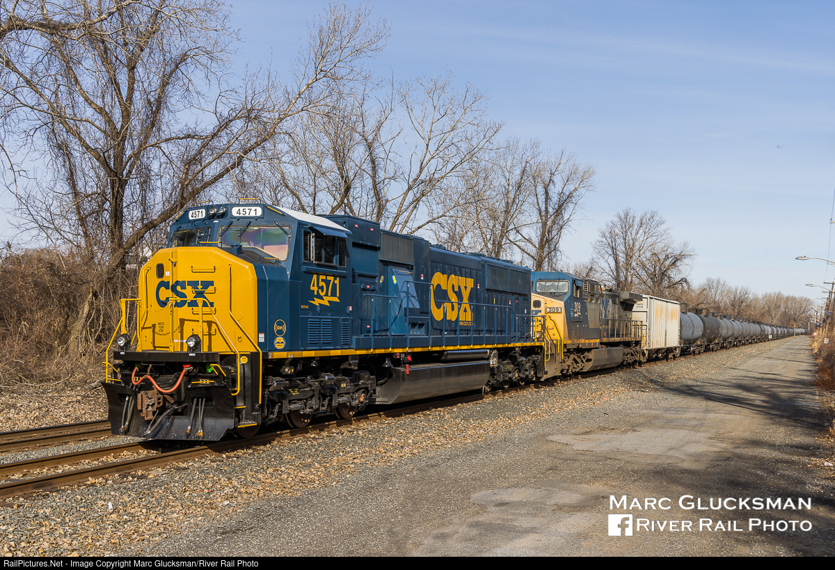 Showroom, Renewed. CSX K682-12 was tied down by Chapel Avenue in Jersey City, New Jersey on Saturday, January 15, 2022 with CSXT 4571 (SD70AC) leading. This unit was built in 3/2000 as CSXT 771, but is a recent graduate of the CSX Huntington, West Virginia Shops Rebuild Program. This process turns SD70MACs into SD70ACs, with a rebuilt EMD 710 prime mover, new display screens, and more. The paint shows CSX's newest variant with its website under the "X", a decal displays the completion of the Huntington rebuild program as an "SD70AC" and just above another emblem shows the the engine can be used in Distributed Power mode.