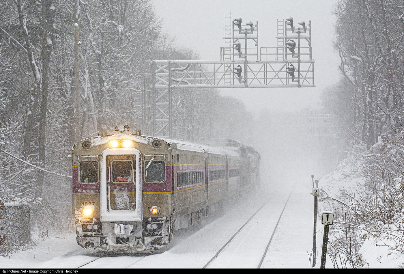 A commuter train from Haverhill runs a little late as it slows to its stop at Melrose Highlands under the first major snow storm of 2022. The signals in the background are for the future interlocking on the border of Melrose and Wakefield. The new signals will finally allow for bidirectional operations on the Haverhill line between Reading and the Fells Interlocking on the Melrose/Malden line. This will sadly mean the fall of the B&M era searchlight signals along the route, but they still stand until the interlocking and track replacement is complete.