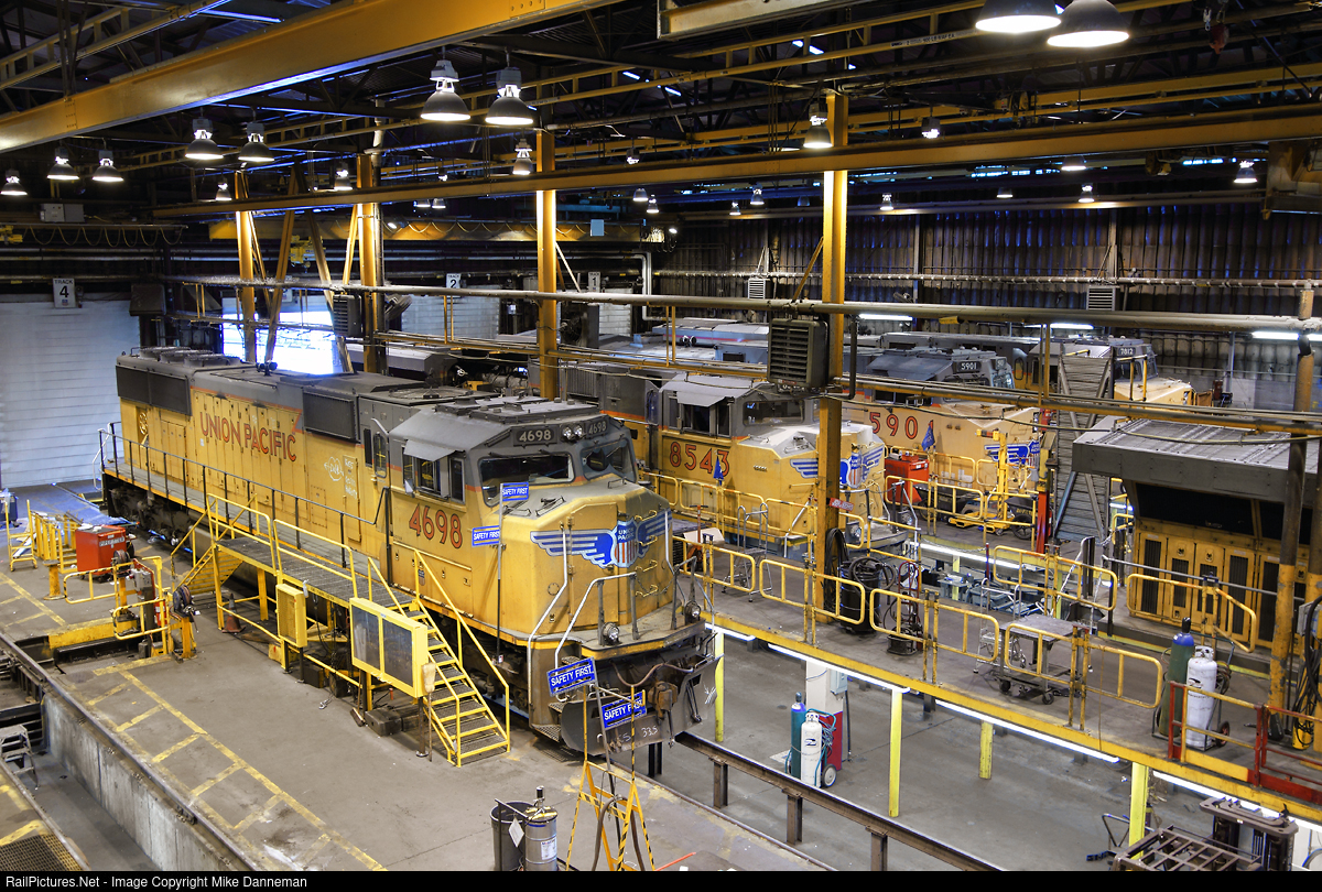 Built in 1874, the shops and yard at Burnham, located a couple of miles south of downtown Denver, Colorado, were the main shop facilities for Rio Grande. In this later view on December 7, 2015, Union Pacific locomotives are repaired and serviced in the newer Diesel House opened in 1965. Lined up on the north end of Track Nos. 1 to 4 are four locomotive models from Electro-Motive Division and General Electric are represented by EMD SD70M No. 4698, EMD SD70ACe No. 8543, GE AC4400CW-CTE No. 5901 and GE ES44AC No. 7812. Recent consolidations have made the facility redundant, closing it in February 2016.
