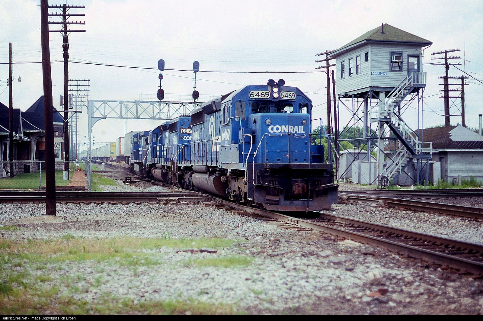 CR 6469 rattles across the NS diamonds in Marion, OH with an eastbound trailvan. The train is passing AC Tower that was active until 1994 and has since been moved across the right of way. It was quite literally a tower as the office was situated high enough for the operator to view the surrounding territory. Nice Erie style signals on the bridge.