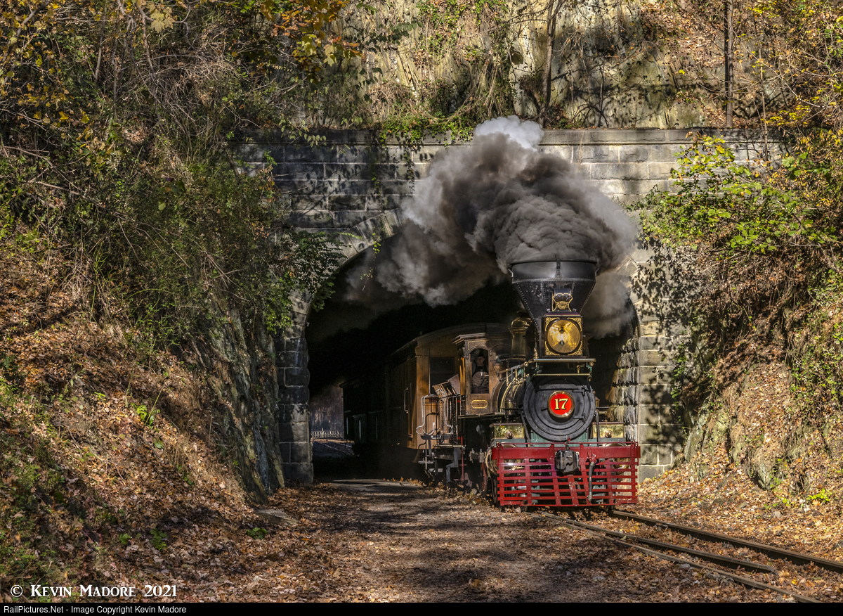 Historic Howard Tunnel. On a late fall afternoon, the Northern Central Railway's York 17 Locomotive comes charging out of the nearly 200 year-old Howard Tunnel, in the town of Seven Valleys, Pennsylvania, with a 4-car passenger train.