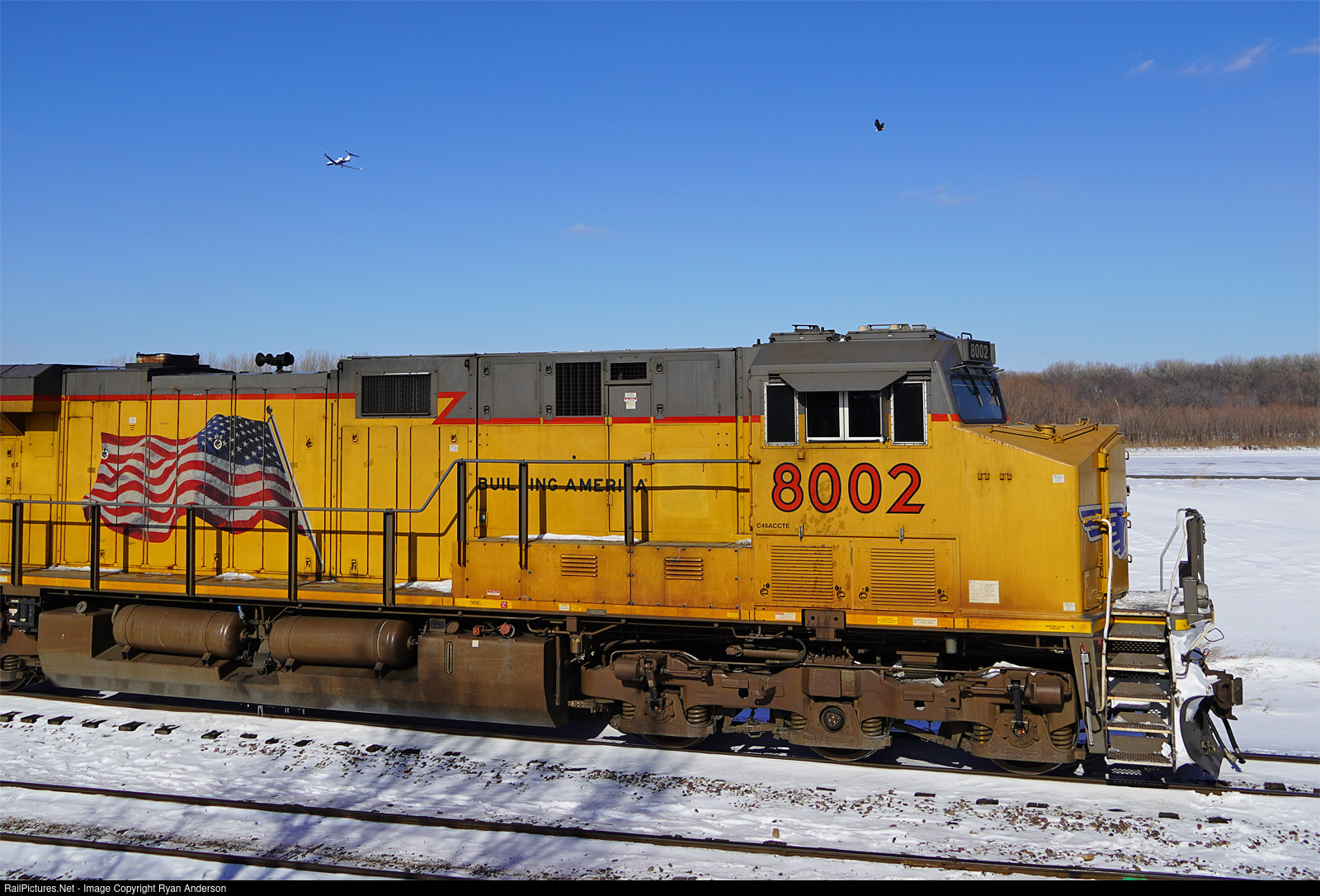 UP 8002 alongside the frozen Mississippi River with airplane and bald eagle flying above.