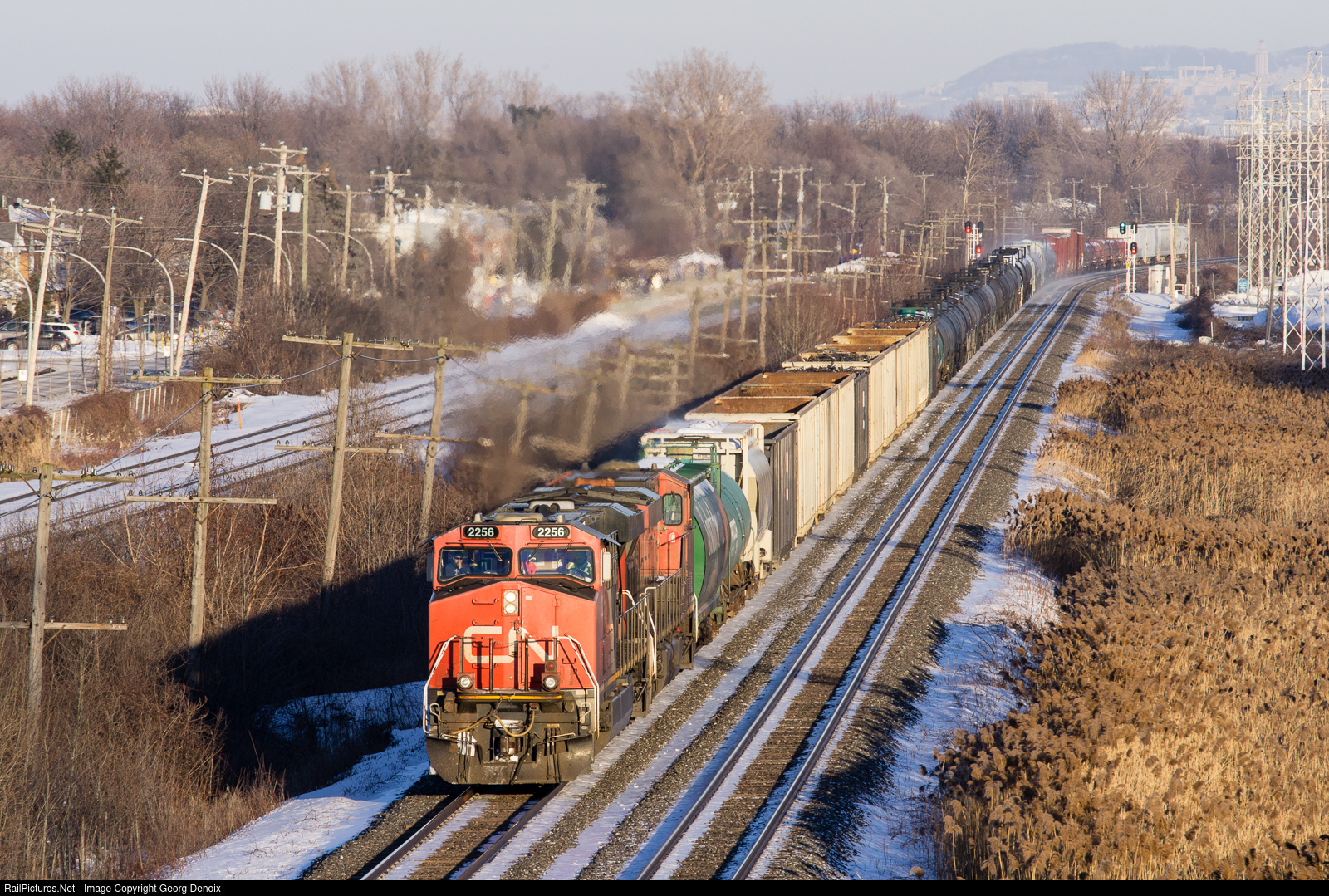 GE ES44DC CN 2256 leads a mixed freight out of Montreal through Pointe-Claire on CN's Kingston Sub on a beautiful January afternoon.