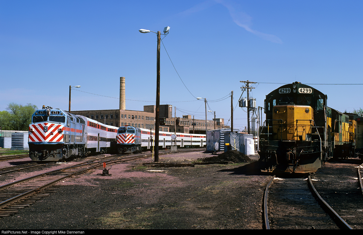 On April 26, 1987, a pair of Metra commuter trains, with locomotives still in RTA colors, sit alongside some Chicago & North Western power at Harvard, Illinois. The brick factory in the background was the Hunt, Helm, Ferris & Co. that manufactured products to streamline farm work. When farmers started referring to the company’s merchandise as the “star” line of farmstead equipment, they renamed the corporation Starline in 1931.