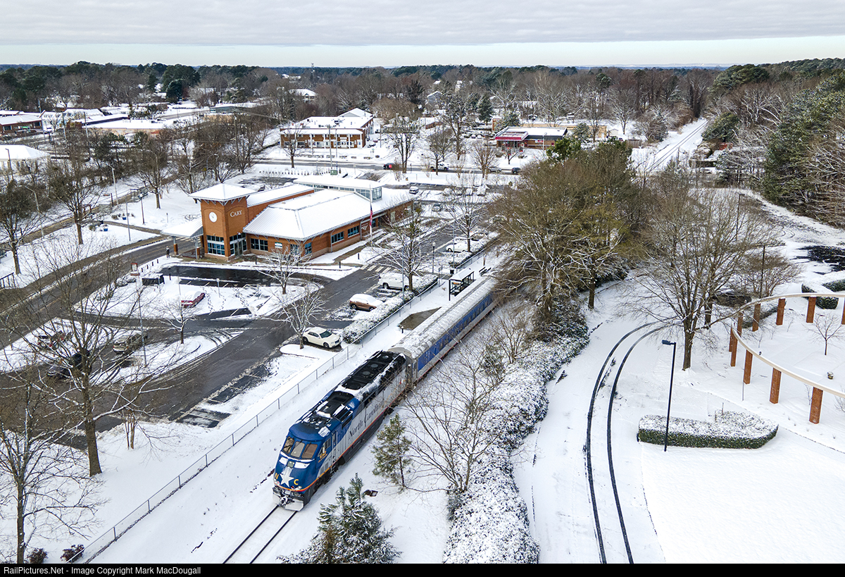 The Cary Depot is usually a busy place with a variety of rail and bus passengers in the morning, but all is quiet after several inches of snow fell overnight as train 75 arrives.