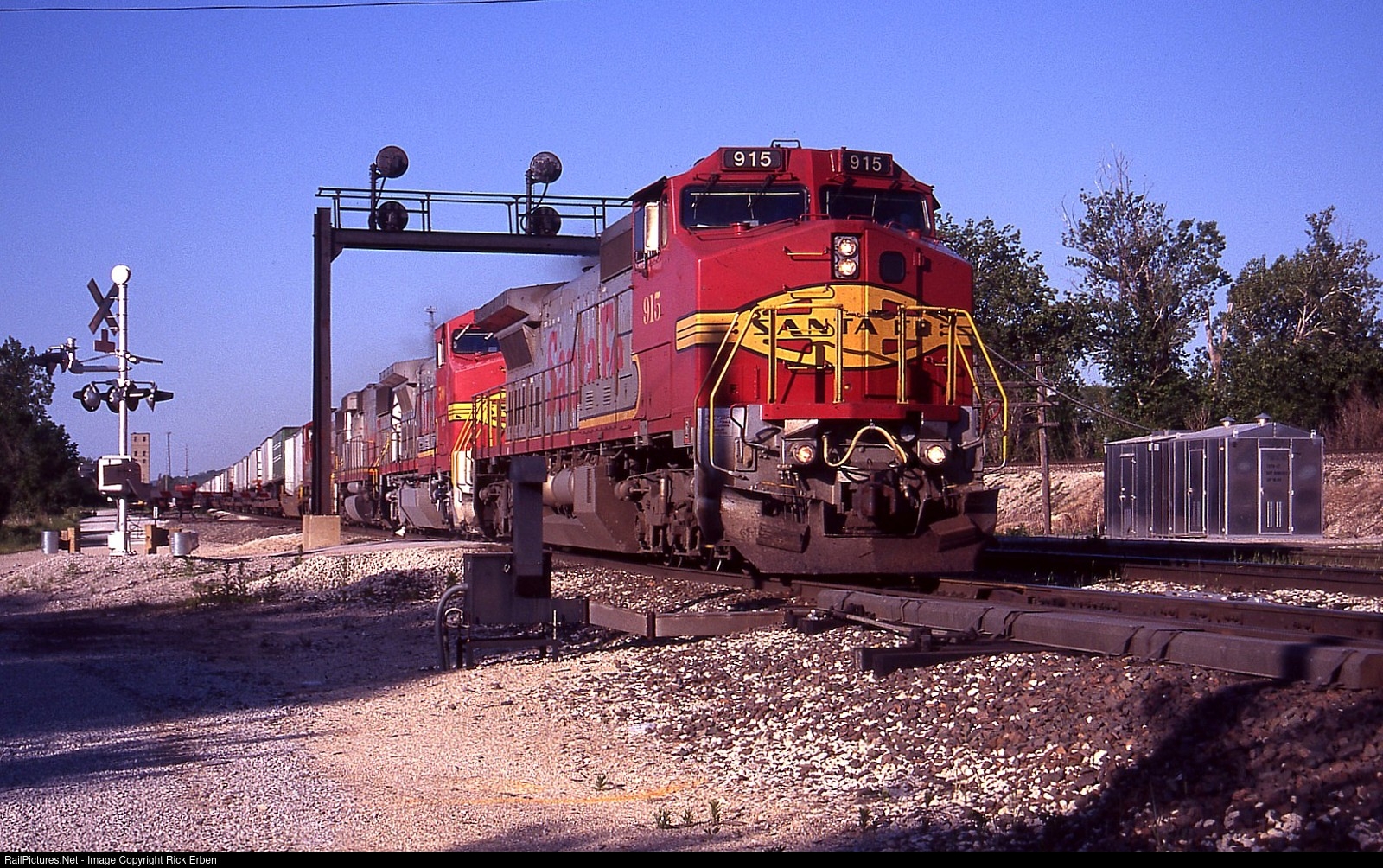 | Getting underway out of Argentine Yard, ATSF 915 leads a Dash8-40BW, GP60 B unit and an SD75M (915-500-331B-218) as it heads west on a June evening. |
