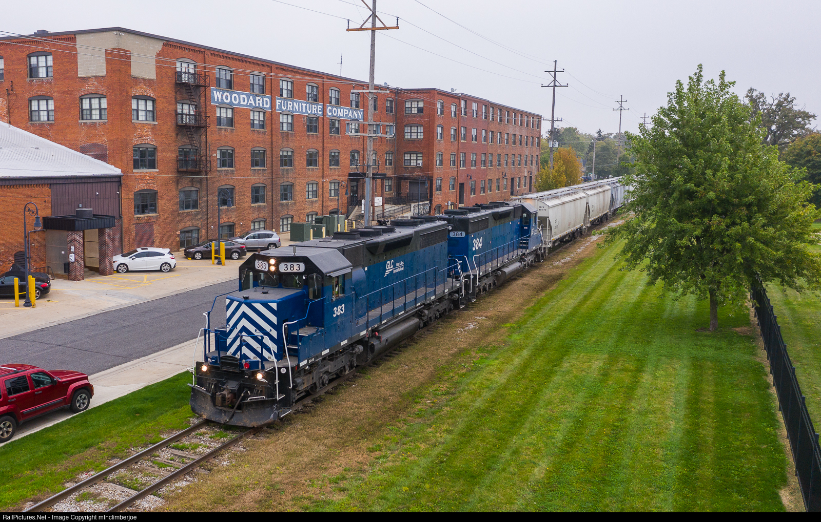 | A pair of former MRL SD35's lead the Great Lakes Central's OSTN as it departs out of Owasso, Michigan and heads north towards Cadillac. In the background is the former Woodard Furniture Company building, now converted into Loft and retail spaces and is listed on the National Register of Historic Places. |