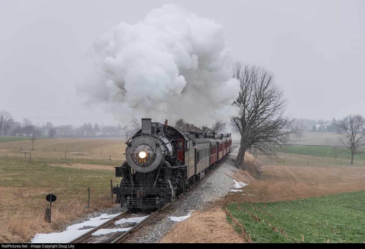 | With the temperature right at the freezing mark and a anow squall just starting to fill the air with flakes, Strasburg’s 4-8-0 475 brings the last train of the day through Carpenters.