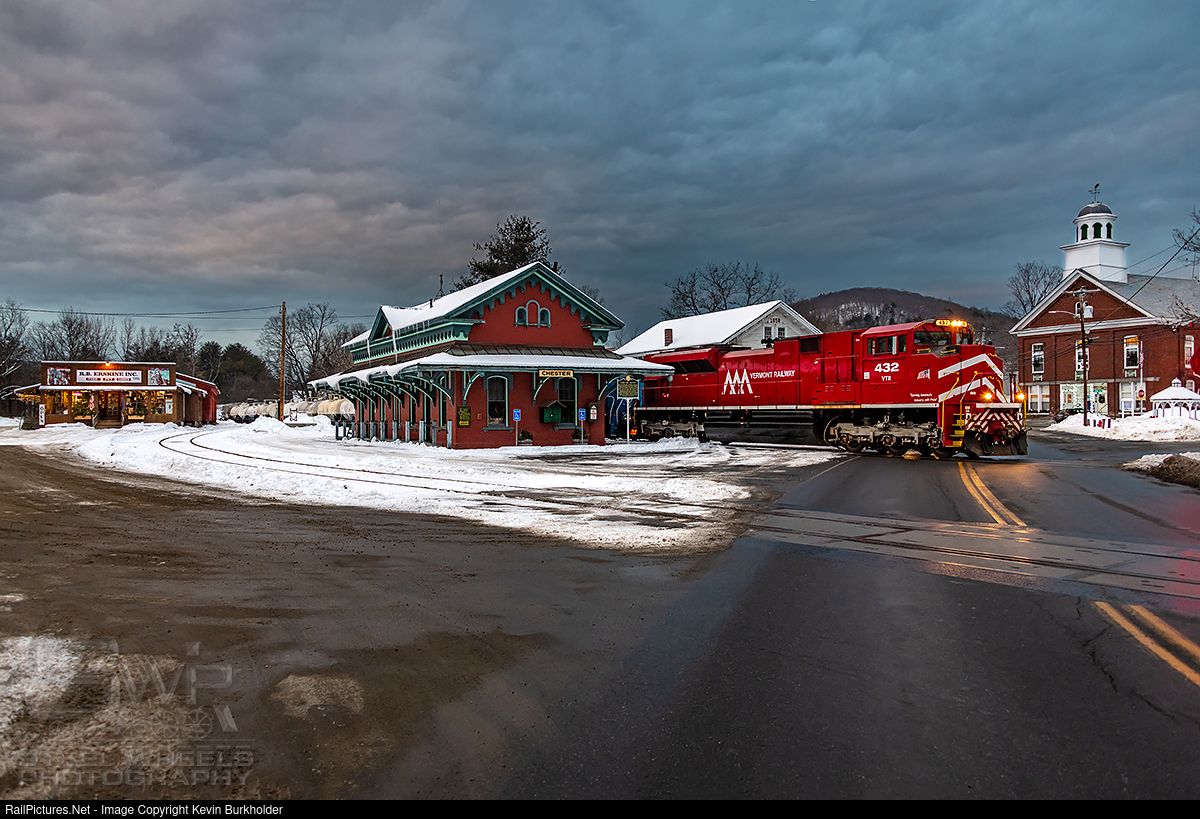With Covid making the rounds among the crews at VRS, customer service requirements dictated sending a Bellows Falls-based crew to run west to Rutland and back with freight. This would be the first XR-1 (Extra Rutland) job in decades and ran west with a single GP38-2 and 21 cars, while returning with the VTR 432, 210 and 202, as seen passing the Chester Depot at sunset.
