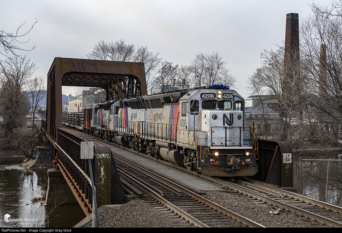 New Jersey Transit's "Hoboken Extra", lead by GP40PH-2Bs 4206, 4211 and 4105, tow a loaded rail train across the Passaic River at Suscon Interlocking on the Main Line in Hawthorne, NJ. The train would spend the day of January 23rd, 2022 dropping sections of continuously welded rail (CWR) at various locations on the NJT Main Line before returning to "home base" at Secaucus Junction.