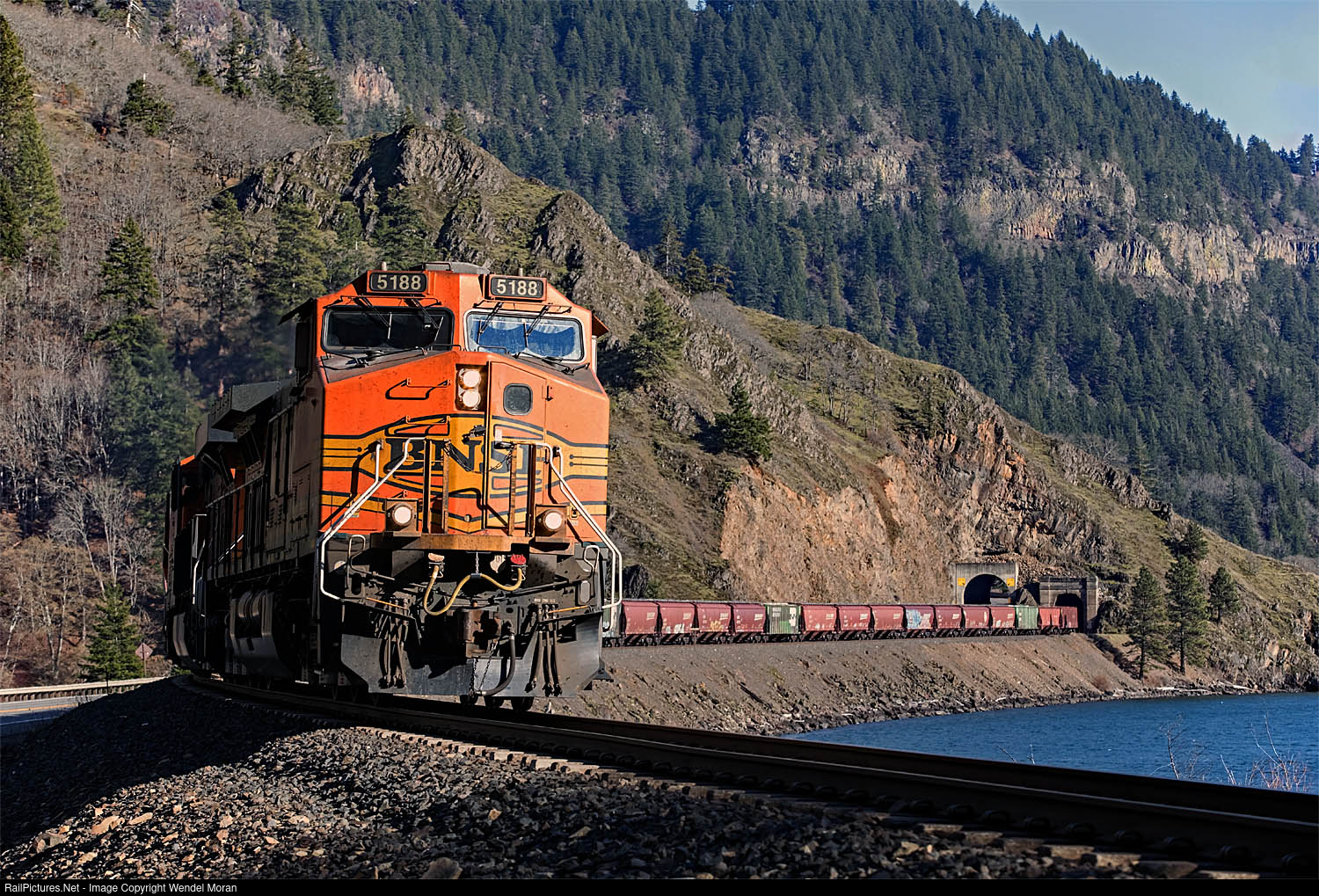 | A trainload of Montana wheat heads for an export terminal in Portland, Oregon. This westbound is about to enter Tunnel 3 on BNSF's Fallbridge Subdivision. |