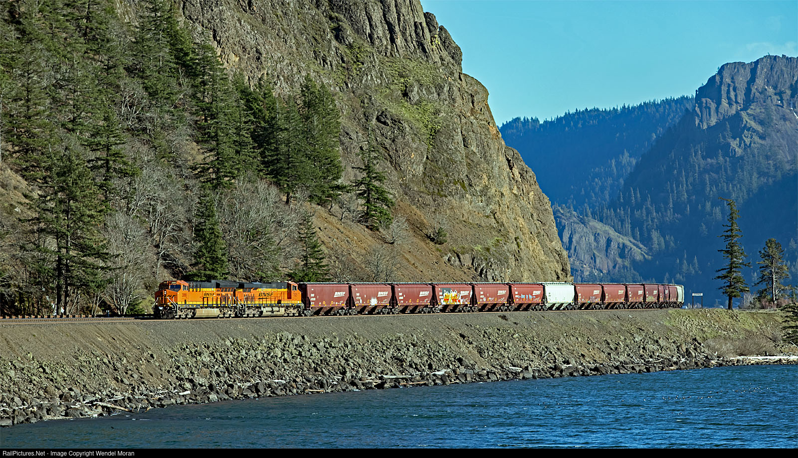 | A westbound trainload of corn for export through the terminal at Kalama, Washington takes siding in the Columbia River Gorge. This is Cooks siding on BNSF's Fallbridge Subdivision. |