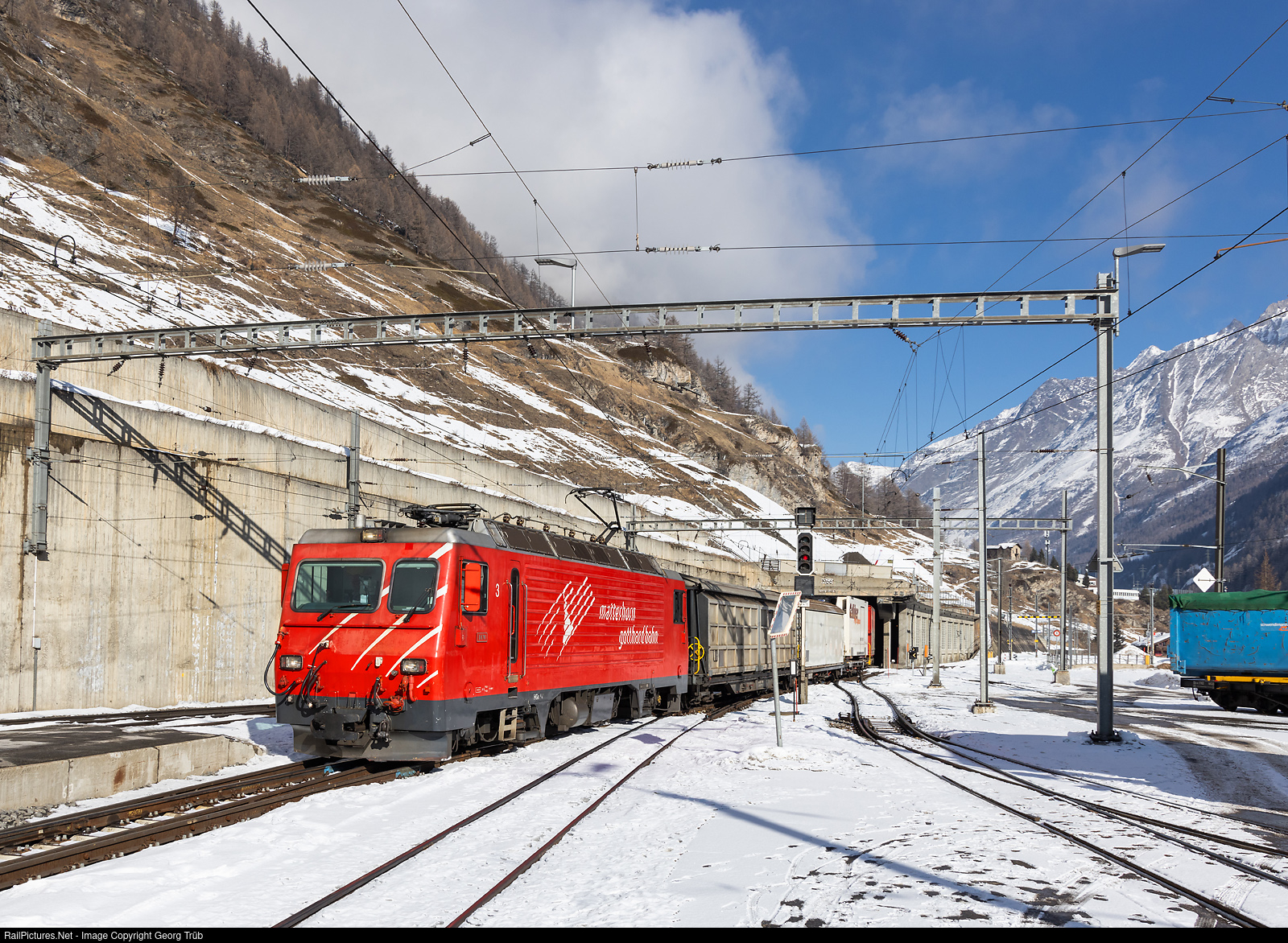 HGe 4/4 II # 3 "DOM" of the Matterhorn-Gotthard Bahn (MGBahn) is entering Zermatt with the freight train 4231 from Visp. Most of the goods are coming by train to Zermatt.