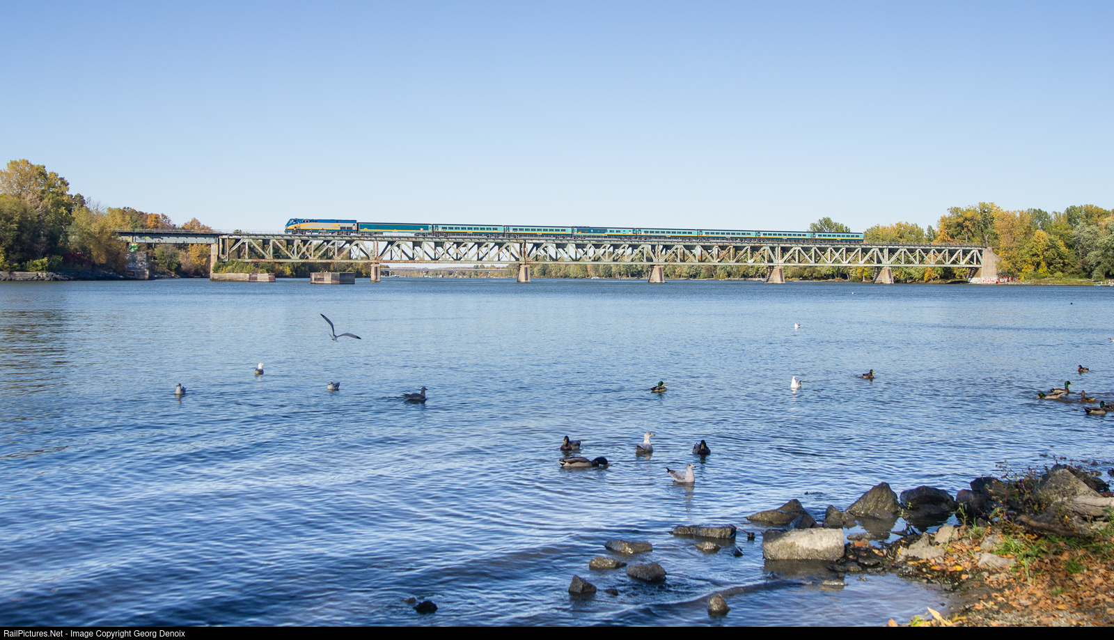 VIA 916 is leading a consist of Renaissance cars westbound over the Richelieu river at Beloeil.