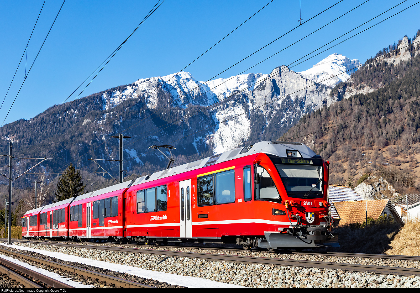 | Commuter train ABe 4/16 # 3101 of the Rhaetian Railway, called STZ (Stammnetz Trieb Zug) or "Stammnetz Allegra", is running the S 1 service 1512 from Rhäzüns via Chur-Landquart to Schiers, between Reichenau-Tamins and Domat/Ems. The RhB has 5 of this trains (# 3101 to 3105) which were built by StadlerRail in 2012/2013. |