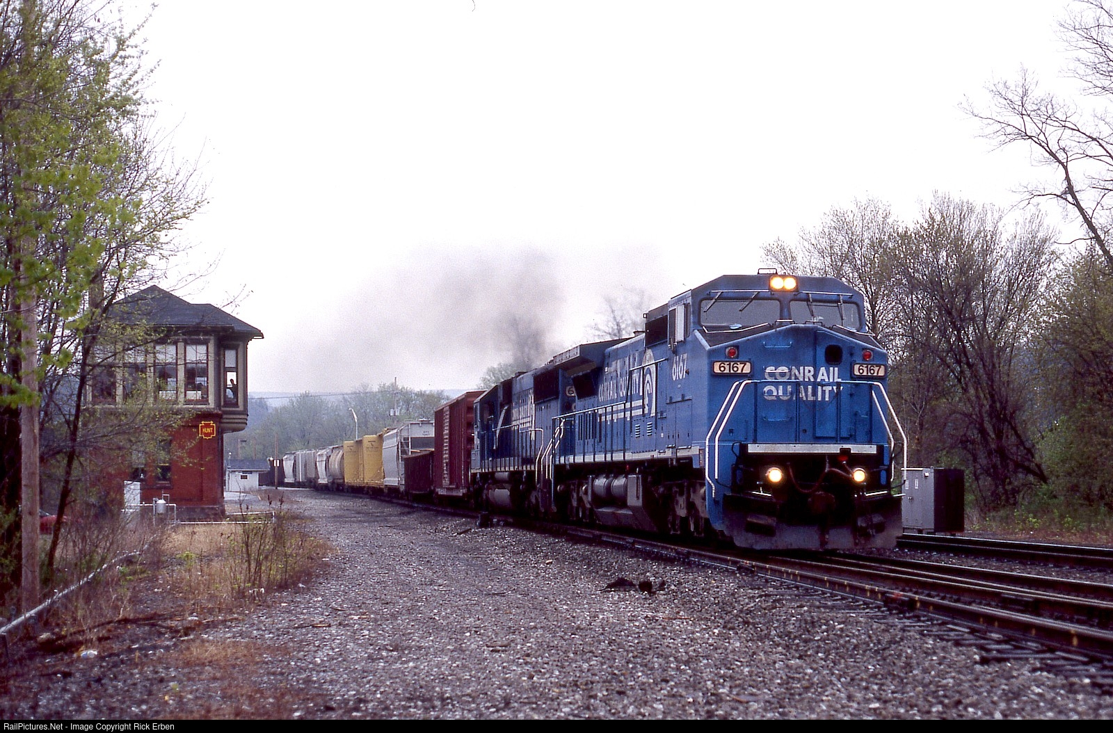 A rainy spring morning in Huntingdon, PA has CR 6167 West crossing over from No.2 to No.1 track. The former Hunt Block Station still stands, although its US&S electro-pneumatic control machine as well as a small CTC panel have been inactive for a decade. Control of the territory was now handled by a dispatcher in Harrisburg.