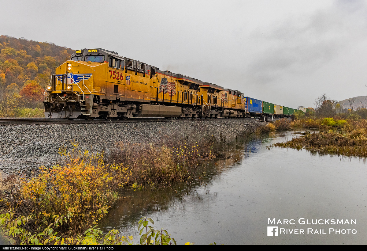 Uncle Pete Visits The Southern Tier. On November 2, 2021, Union Pacific Railroad GE ES44ACs 7526 and 7864 led Norfolk Southern Corp Train 22K as it approached the crossing at Kennedy Road in Swain, New York. Perhaps these engines are used to the sunny skies of the California Pacific Coast or the deserts of Utah, but in this case received the weather of a very typical mid-New York autumn day.