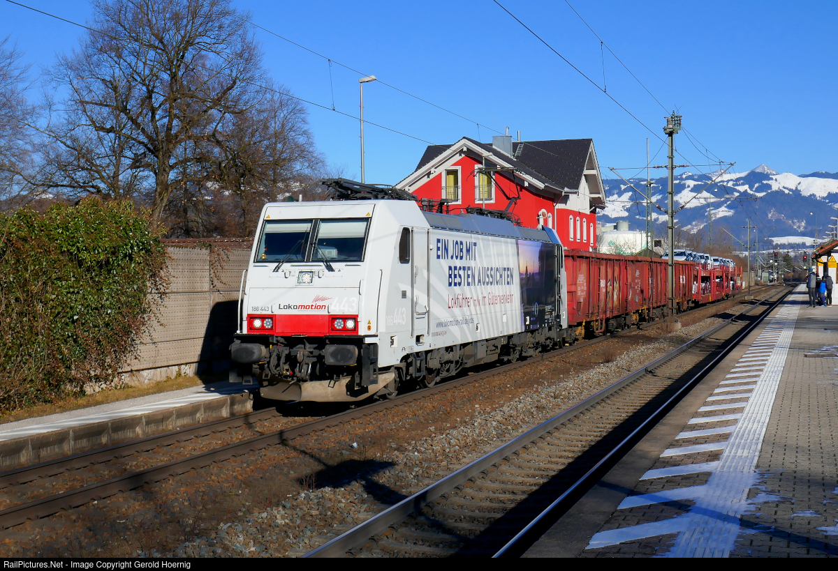 | Locomotive 186 443 with its large advertising for locomotive engineers jobs is hauling a short freight train through Kiefersfelden Station on the busy Munich, Germany to Kufstein, Austria main line. |