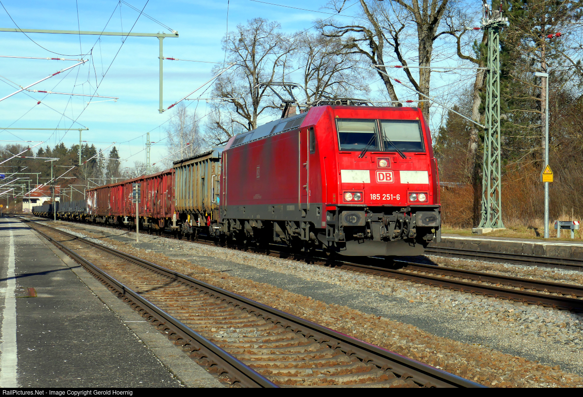 | Locomotive 185 251 is hauling a short freight train through the station of Aßling, Bavaria on the busy Munich to Rosenheim line.